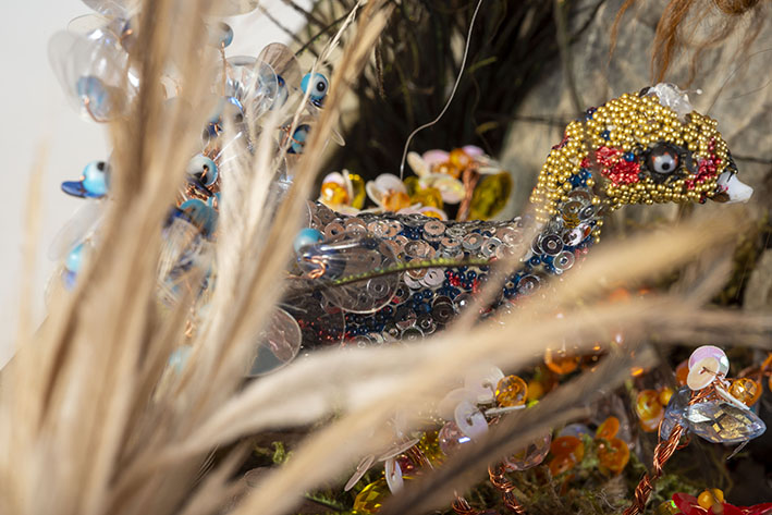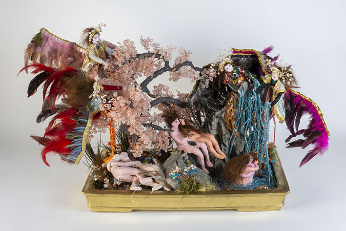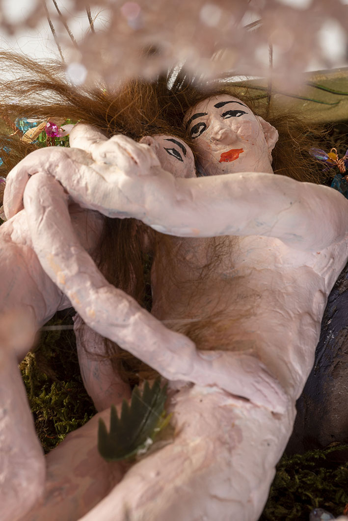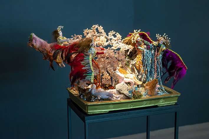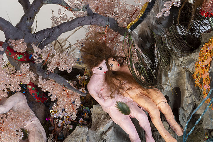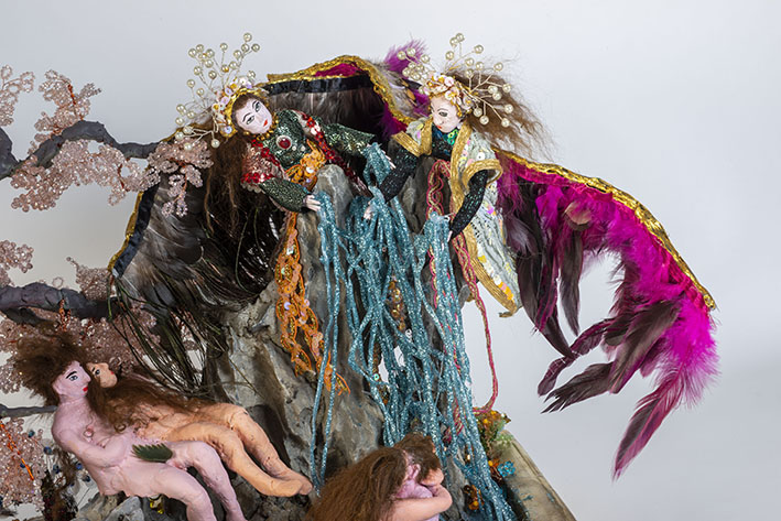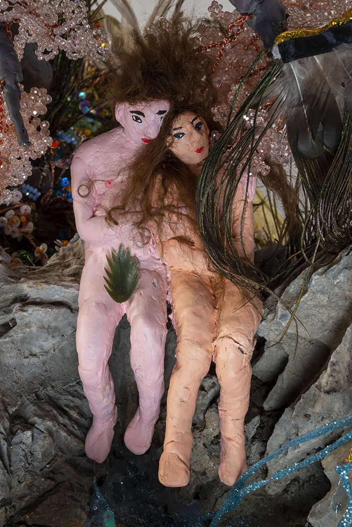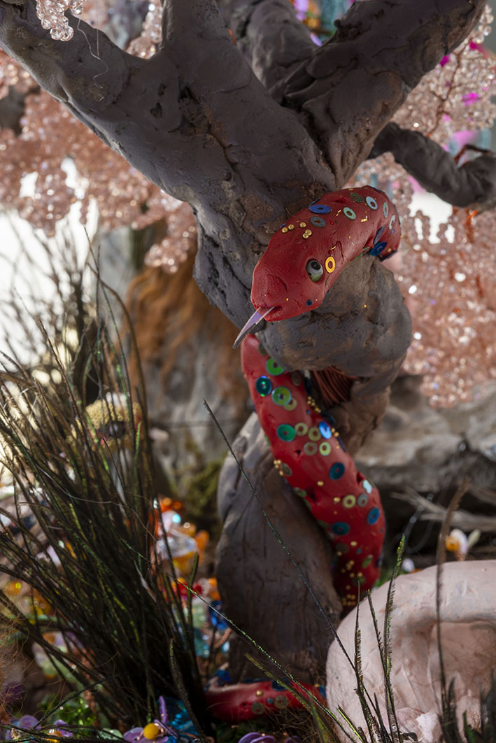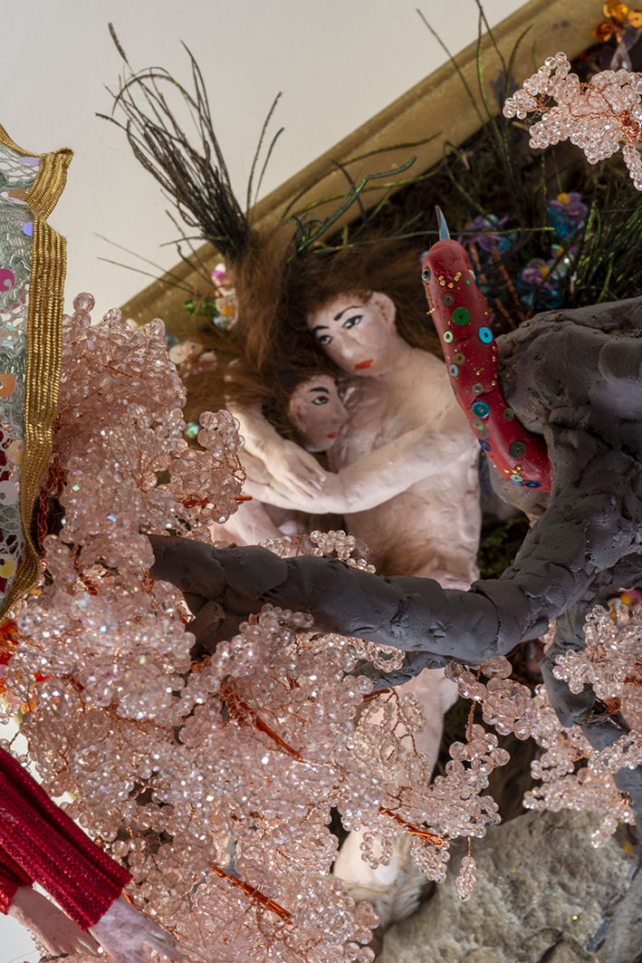 (2020) Yapıt bir cennet görüntüsünde olan masalsı bir doğadan oluşur. Cennet imgesi her ne kadar ilahi alana ait gibi gözüksede aslında imgesel olarak dünyaya aittir. Ağaç, göl, şelale gibi muhteşem bir doğa tasfirinin içinde çıplak bedenli insanların ağacın altında suyun içinde eğlendikleri, aşkın mutluluğu ve güzel doğanın rehaveti içinde umursamaz kaygısız bir şekilde eğlendiklerine tanıklık ederiz. Ağacın üzerinde ve şelalenin başındaki melekler, yine bize buraya ait olmayan, manevi duygularımızın sembolik karşılığıdır. Ya da evrimsel süreçten bize kalan sezgilerimizin bir karşılığı… Yapıt, cennet kavramının dünyaya ait, mutluluk özlemelerimizin ölümden sonraya ertelenmeyen, şimdi ve yaşadığımız anda olduğuna dair metaforik bir söz söyler. Yapıt, hayal dünyamızda cennete varolduğunu düşündüğümüz renkli ve efsanevi hayvanları barındırdığı kadar herbirimizin kollektif hafızasında sembolik olarak negatif anlamları olan hayvanları da içinde pozitife çevirerek barındırır. İslam mitolojisinde kibri temsil eden tavuskuşu gururu temsil ederken yılan günaha teşvik eden yerine şifanın karşılıdır. Ya da hiçbirisini sembolik olarak temsil etmeden doğanın parçası olan hayvan ve insanların birlikte yaşamasının getirdiği bir uyumdan ibarettir.